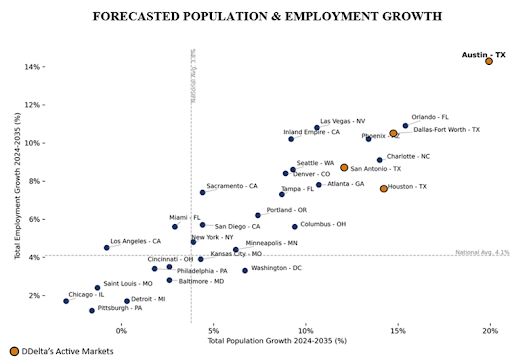 Austin continues to rank among the top-performing U.S. metros for both population and job growth. Combined with a record surge in renter demand and institutional capital entering the Build-to-Rent space, this is the right time to explore opportunities in America’s next boomtown.